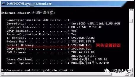 如果出现下图所示,说明DHCP服务器相应工作域的“003 默认路由” 的设置错误。